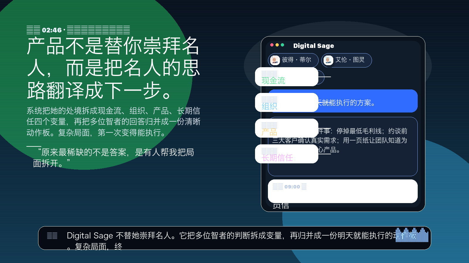 100 位智者目录、切换人物、真实问题、归纳行动板,都直接在画面里出现。